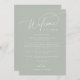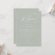 Esta elegante modelo de casamento verde é perfeita para um casamento simples. A design moderna minimalista apresenta a caligrafia verde-pastel eterno e romântica com estilo de conto de fadas boêmico. A frente da nota de boas-vindas apresenta uma carta de boas-vindas ao casamento e a parte de trás apresenta a linha do itinerário do casamento. Estas notas são perfeitas para casamentos de destino e bolsas de boas-vindas de hóspedes.