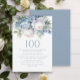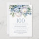 Convite de aniversário de 100 anos feminino elegante em azul poeirado e floral branco. Este convite pode ser adquirido impresso ou como um convite digital para compartilhar com familiares e amigos nas redes sociais ou por e-mail. Entre em contato para obter ajuda com suas personalizações ou para solicitar produtos Zazzle adicionais correspondentes ou coordenados para sua festa.