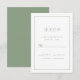 O design elegante do cartão de resposta RSVP apresenta escrita elegante e letras em verde sage romântico em um fundo branco crocante. O verso do cartão de resposta é verde sólido. Para obter resultados ótimos, substitua os detalhes do modelo pelos seus próprios detalhes. Envie um e-mail para invitationsuites@gmail.com com perguntas ou solicitações de cores personalizadas. Sinta-se à vontade para entrar em contato comigo em invitationsuites@gmail.com se tiver dúvidas sobre este ou qualquer outro design.