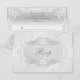 Cartões planos personalizados de RSVP de casamento. Elegantes e glamourosos cartões de RSVP de casamento em prata e branco com damasco impressos em papel de convite. Convites duplos modernos, contemporâneos, bonitos e fashion, com uma placa de identificação com trabalho de pergaminho ornamentado e sofisticado sobre um fundo com lindo damasco. Todo o texto é totalmente personalizável para atender às suas necessidades e você pode alterar o estilo, a cor e o tamanho da fonte, se desejar. Tenho convites de casamento e outros produtos correspondentes em minha loja. Arte original ©delightful-doodles.com. Se precisar de ajuda para personalizar seu produto, entre em contato comigo através da minha loja e ficarei feliz em ajudar. POR FAVOR, OBSERVE: Todos os convites na Zazzle têm imagens impressas planas.