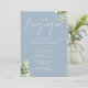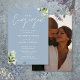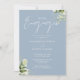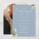 Este convite de noivado com flores em azul poeira e folhagens pode ser personalizado com suas informações em tipografia sofisticada e sua foto no verso. Criado por Thisisnotme©