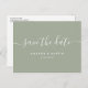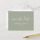 Convites de noivado minimalistas elegantes em verde sage com uma fonte moderna de letra script. Itens correspondentes disponíveis. Solicitações personalizadas são bem-vindas.