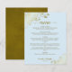 Esses lindos menus de casamento são simples, elegantes e na moda, enquanto ainda são amigáveis e baratos. Eles apresentam um design elegante e glamouroso com rendas de folha de alumínio falsa ouro e caligrafia de script em um fundo azul pálido e em pó. O fundo é uma bela cor dourada marmoreada.