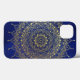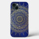Uma bela capa de telefone circular floral de mandala design em ouro luminoso sobre fundo azul profundo, inspirada pela arte do corpo de hndi henna. Carregar esta arte meditativa com você todos os dias no seu telefone.