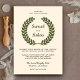 Convide seus convidados com este elegante convite de casamento, com uma bela coroa verde de louros contra um fundo bege. Basta adicionar os detalhes do seu evento neste modelo fácil de usar para torná-lo um convite de tipo único.