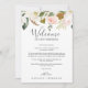 Estas elegantes cartas de boas-vindas brancas da magnólia e cartas itinerárias são perfeitas para um casamento clássico moderno. O design floral suave apresenta coloração aquosa, cor-de-rosa-pincelada, impressionantes flores brancas de magnólia com ouro e folhas verdes em um arranjo luxuoso. A frente da carta apresenta uma carta de boas-vindas e a parte de trás da carta apresenta o itinerário do casamento. Estas notas são perfeitas para casamentos de destino e bolsas de boas-vindas de hóspedes.