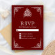 Cartão RSVP Elegante com uma elegante fronteira ornamentado branca e "Bismillah" na caligrafia árabe contra um fundo vermelho escuro.
