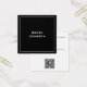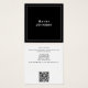 Um elegante cartão de visita preto moderno e minimalista com espaço para seu nome e informações de contato. Este design inclui um código QR na parte traseira.