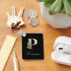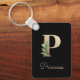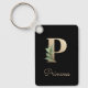 Chaveiro preto elegante com um monograma botânico dourado no centro.
