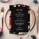 Um belo modelo floral clássico de cardápio clássico de casamento mostra um adorável padrão de vintage de flores vermelhas e cor-de-rosa em um fundo preto elegante