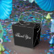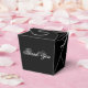 Uma caixa de favoritos elegante e elegante de piquenique com manípulo de prata, perfeita para qualquer evento especial, incluindo o favor de casamento ou o obrigado corporativo. Personalizar texto ou o texto é removível. O fundo preto pode ser alterado para qualquer cor.