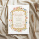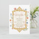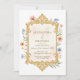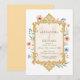 Um design de convite de casamento elegante com uma moldura ornamental dourada vintage rodeada por flores em aquarela em tons de rosa, pêssego e azul. O layout refinado e a tipografia clássica criam uma estética romântica e atemporal inspirada na papelaria europeia. Perfeito para casamentos formais, de jardim ou clássicos, este design equilibra luxo e suavidade, tornando-o ideal para casais que buscam um estilo de celebração gracioso e sofisticado.