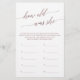 Este elegante jogo de caligrafia rosa dourada "quantos anos ela tinha" é perfeito para um simples chá de panela. O design cor-de-rosa-pincelado apresenta um cartão de jogo minimalista decorado com tipografia da folha de ouro rosa romântica e caprichosa. Personalize o jogo com o nome da noiva. Nota: Este design não apresenta folha de ouro rosa real. É um gráfico de alta qualidade feito para se parecer com folha de ouro rosa.