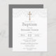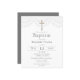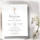 Papel de barato personalizável, convites para batismos, com impressão de local e crucifixo para tons de ouro em um fundo branco limpo.