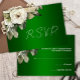 Traga uma sensação de elegância eterno e boho chorão para o dia do seu casamento com nosso lindo RSVP de casamento verde esmeralda com um buquê glorioso de lindas rosas brancas. Essa mistura perfeita de beleza botânica impressionante e charme clássico, este convite do bouquet rosa em uma forma muito popular de verde certamente vira cabeças e faz seu anúncio de casamento se destacar. Obrigados ao seu design ponderado, é fácil personalizar este cartão de resposta para ajustado das necessidades de cada casal.