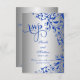 2021 Socialite Designs. Um cartão de resposta RSVP elegante azul real e prata com espirais decorativas nos cantos, pronto para ser personalizado para o seu evento. O estilo da fonte, texto e tipo de papel podem ser alterados. Precisa de AJUDA com a personalização? Por favor, não hesite em contactar Socialite Designs.