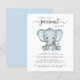 Um belo e econômico convite de chá feito por um bebê, apresentando "Um doce amendoim está a caminho" escrito em uma mistura de tipografia moderna de cinza macia e roteiro de na moda, e uma aquarela azul pastel de um elefante bebê. Personalize o nome da mãe e os detalhes do chá em uma simples tipografia de cinza.