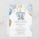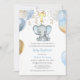 Este adorável convite batismo apresenta elefante azul e cinza com balões, confetti e cruz dourada. A parte traseira apresenta aquarela azul macia. Personalize facilmente o evento clicando em "Personalizar".