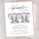 Um convite para o chá de meninas gêmeas bonitinhas e amigáveis ao orçamento com "Dois Pequenos Amendoins Doce Estão A Caminho" escrito em tipografia moderna de cinza mole e um roteiro de na moda, e duas aquarelas cor-de-rosa pastel de elefantes bebês. Personalize com o nome da futura mãe e os detalhes do chá em simples tipografia de cinza.