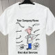 O eletricista está cercado por cabos. Promova seu negócio de Serviços Elétricos com um T-Shirt cartoon. Torne-o pessoal adicionando o nome da sua empresa à frente e atrás. Adiciona também o número de telefone ao contrário.