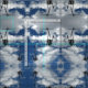 O tecido de conversação do teste padrão caracteriza as cadeiras vazias do elevador de esqui que penduram de seus cabos do elevador em uma fotografia repetida. Sem cavaleiros, os elevadores de esqui olham como um diagrama linear preto na frente de uma caro vista do céu azul e das nuvens inchado brancas. O design do tecido da novidade forma um teste padrão em dois sentidos.