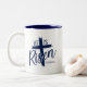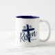 A caneca de café é mostrada em azul-marinho e branco com uma impressão Ele Ressuscitou.