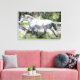 Uma impressão de aquarela de um cavalo andaluz e German shepherd Cachorro indo para uma corrida.
