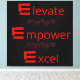 Uma série de ícones "E" vermelhos ousados, cada um seguido de uma palavra poderosa: "Elevate", "Empower" e "Excel". As palavras são acompanhadas por linhas onduladas que sugerem movimento ou progressão, simbolizando a jornada rumo ao crescimento pessoal e à conquista. É uma forma excelente de inspirar a nós mesmos e aos outros para lutar pela excelência.