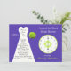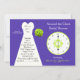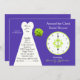 Este adorável chá de panela do relógio é o convite perfeito ao redor do relógio para a noiva cujas cores são roxa e verde. O convite apresenta um vestido de noiva de branco à esquerda, um buquê de rosas de verde à direita junto com um relógio de coordenação. Todos os detalhes importantes do chá de panela do relógio aparecem dentro o vestido de noiva. Uma maneira maravilhosa de convidar seus hóspedes para um chá de panela do tema 24. Direitos autorais