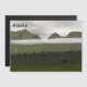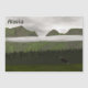 Uma pintura "primitiva" ou folclórica de coníferas e montanhas verdes num dia muito cinza com nuvens suspensas baixas. Um alce de touro (Alces Alces) no primeiro plano dá escala à cena. Leitura personalizável de texto, "Alaska" também é exibida.