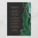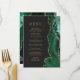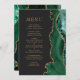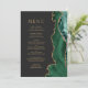 A borda direita deste elegante cardápio moderno de casamento apresenta uma esmeralda verde aquarela agata borda com falsa brilho dourado. O texto personalizável combina fontes serif e copperplate de cor dourada em um plano de fundo off-black. O verso apresenta um design verde e dourado correspondente.