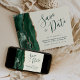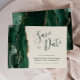Este elegante e moderno salve o cartão de data apresenta um emerald verde aquarela agate border aparado com falso brilho dourado. O texto personalizável combina o script de escrita manual, as fontes em copperplate e itálico em verde esmeralda em um fundo de marfim. O verso apresenta um design emerald verde e dourado.