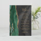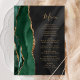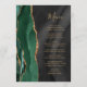 A borda esquerda deste elegante cardápio moderno de casamento apresenta uma esmeralda verde aquarela agata borda com falsa brilho dourado. O texto personalizável combina um script de escrita manual branco dourado e fontes de impressão em um fundo de cor d'água preta. O verso apresenta um design emerald verde e dourado.