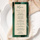 Este elegante cardápio moderno de casamento apresenta uma cor verde-esmeralda de água. O texto personalizável combina um script de escrita manual branco verde com fontes itálicas e de impressão em um fundo bege de champanhe. O verso apresenta um design emerald verde e dourado.