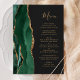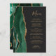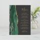 A borda esquerda deste elegante cardápio moderno de casamento apresenta uma esmeralda verde aquarela agata borda com falsa brilho dourado. O texto personalizável combina o script de escrita manual branco dourado e as fontes de impressão em um fundo preto de ardósia. O verso apresenta um design emerald verde e dourado.