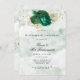 Design apresenta um elemento floral impresso em tons de verde esmeralda sobre folhas de ouro e florações de pedras em um fundo verde claro de aquarela e brilho de ouro. Excelente para as comemorações do casamento!