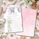 Este divertido jogo de chá de fraldas apresenta elefante de menina rosa e cinza com balões e confete. Seus hóspedes podem resolver as rimas dos berçários decodificando os emojis/emoticons. Chave Emoji: 1. Diddle Diddle 2. Twinkle Twinkle Pequena Estrela 3. Itsy Bitsy Spider 4. Cinco macacos pulando na cama 5. Dickory Dock 6. O velho MacDonald tinha uma Fazenda 7. Enche O Pequeno Bebê 8. Rub-a-Dub-Dub 9. Menina Muffet 10. Um, Dois, Meu Calçado 11. Jack e Jill 12. Fila Row Row Seu Barco 13. Havia uma velha mulher 14. Star Light Star Bright 15. Baa, Baa, Ovelha Negra