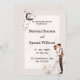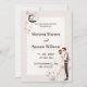 O convite romântico para o casamento, com uma ilustração encantadora da noiva e do noivo. O fundo é bege suave com folhas delicadas. A design é bela e elegante, perfeita para um casamento romântico.