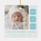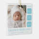 Celebre a chegada do seu pequeno com este lindo enfeite personalizado de estatísticas de nascimento de bebê. Projetado com detalhes em azul suave e espaço para a foto do seu recém-nascido, este enfeite inclui detalhes como nome, data de nascimento, peso, altura e hora. Um enfeite atemporal que torna uma adição significativa à sua árvore de Natal ou um presente atencioso para novos pais e avós. Personalize facilmente para criar uma memória preciosa que será apreciada por anos.