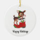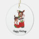 Adicione um toque de charme nostálgico à sua árvore de Natal com este enfeite redondo de cerâmica personalizado. Com uma rena fofa em estilo vintage ao lado da bota do Papai Noel e uma bengala de Natal festiva, este enfeite é uma volta deliciosa ao clássico espírito natalino. As palavras "Felizes Festas" são elegantemente exibidas e pode ser personalizado com o ano para torná-lo uma lembrança memorável.