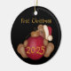 O primeiro enfeite de Natal do bebê com um ursinho de pelúcia num boné vermelho com uma grande bola vermelha! Você pode adicionar o nome do bebê, a data e a hora de nascimento, a altura e o peso, e o ano atual a este ornamento de feriado de manutenção totalmente personalizável.