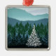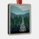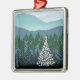 O pinheiro solitário AZUL do NATAL A do CUME com luzes brancas está em uma floresta com as montanhas no fundo.