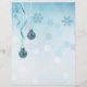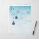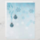 Ilustração de Natal em azul: ornamentos azuis de brilho com fitas enroladas sobre fundo branco-azul-boque.