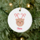 Este Enfeites de natal apresenta uma ilustração de uma Reindeer Vermelha Nosed com canaviais. A rena tem longas chicotadas e um doce sorriso. O nariz vermelho é enchido com simulação de brilho vermelho (não com brilho real). Personalizou este Enfeites de natal com o seu nome.