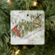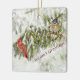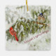 Os enfeites de natal bonitos que caracterizam um jay cardinal e azul empoleiraram-se em ramos cobertos de neve do pinho.