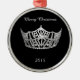 Enfeites de natal mostrados em uma forma redonda com uma prata e uma coroa e um fundo pretos da cor. Mostrado com fita vermelha e a prata orlaradas. Texto do Feliz Natal no branco. Personalize este artigo com sua nome, data ou outro pessoal da representação histórica.