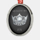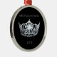 Enfeites de natal mostrados em uma forma redonda com uma coroa de prata bonito, com texto do fundo Prata-Cinzento e preto da cor. Mostrado com fita vermelha e a prata orlaradas. Personalize este artigo com sua nome, data ou outro pessoal da representação histórica.