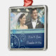 O ornamento da foto do casamento no inverno customizável com sua própria foto do casamento e o casamento datam no azul e na turquesa elegantes com teste padrão festivo dos flocos de neve e dos redemoinhos. Um presente à moda do Natal para a família e os amigos ou para decorar sua árvore ou casa de Natal para os feriados. A maneira perfeita de recordar seu dia de casamento no inverno.