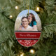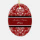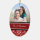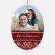 Ornamento da foto do Natal dos casais ø customizável com seus próprios foto, nomes e data no vermelho elegante, cor damasco floral clássica preto e branco. Uma maneira à moda de decorar sua árvore ou casa de Natal para os feriados. A maneira perfeita de recordar junto seu primeiro Natal como um casal.