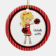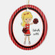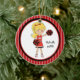 Este é uns enfeites de natal adoráveis para esse cheerleader em sua vida! É um cheerleader bonito com cabelo louro longo e um arco vermelho em seu cabelo. Está guardarando dois poms do pom em suas mãos. Está vestindo um uniforme vermelho com branco e o preto nele. É ajustada em um grande círculo íntimo branco esboçado no vermelho e no preto. O fundo é listras vermelhas escuras e claras. Verifique para fora o muito outro design e cores nesta linha. Ame esta lembrança para muitos, muitos anos! grampo ©crafty